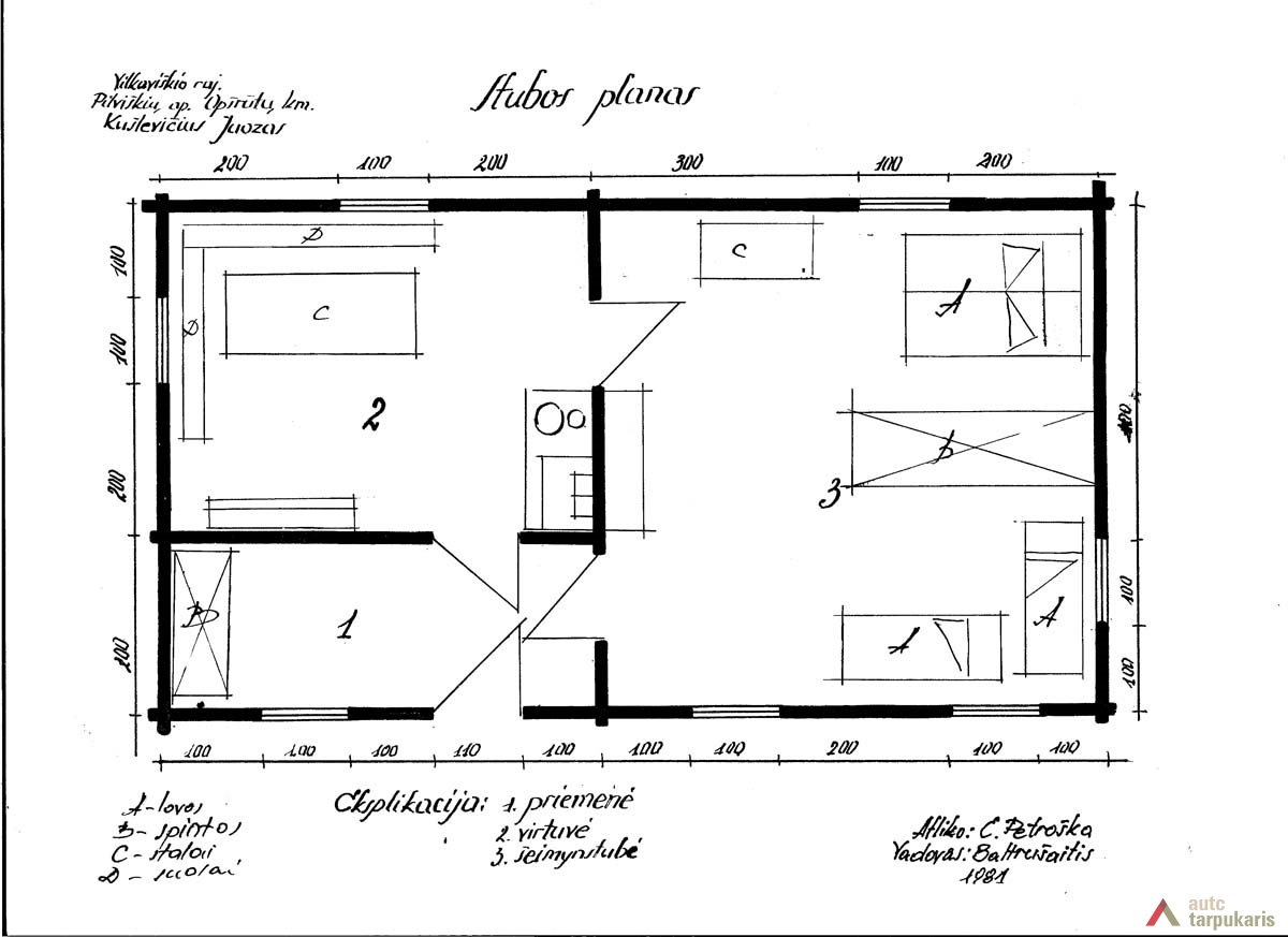 Suvalkietiško gyvenamojo namo (stubos) planas su interjero schema. Pastato ilgis 11 m, o plotis 6 m. Namo planavimas nėra baigtas, nes trūksta seklyčios. Matyt, kadaise jį statėsi neturtingas ūkininkas. Į pastatą patenkama per priemenę, o iš jos durys veda į virtuvę ir šeimynstubę. Virtuvėje stovi stalas su suolais, viryklė. Pastatui šildyti tradiciškai naudota tik šiam regionui būdinga krosnis-viryklė („mašina“) su pakura iš virtuvės (ten virdavo valgį) ir šiltasuoliu („mašinsuoliu“) stuboje.