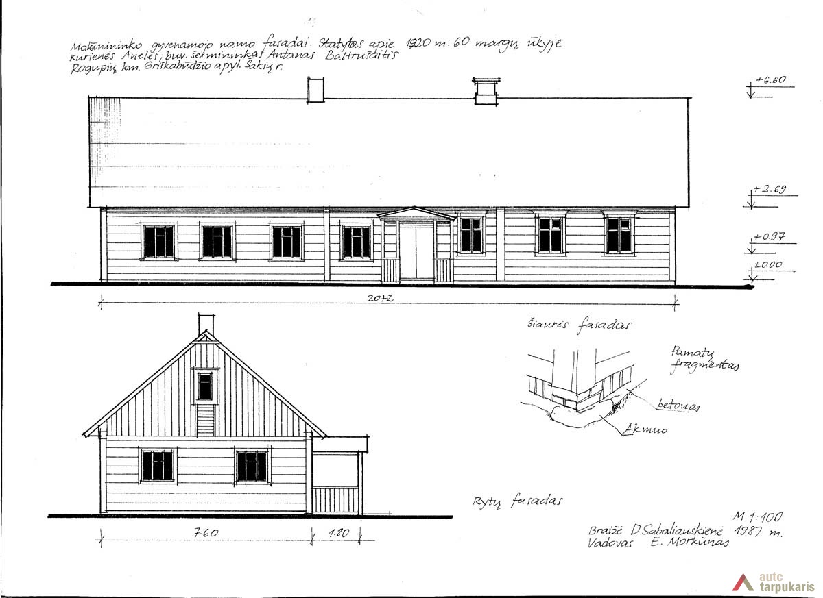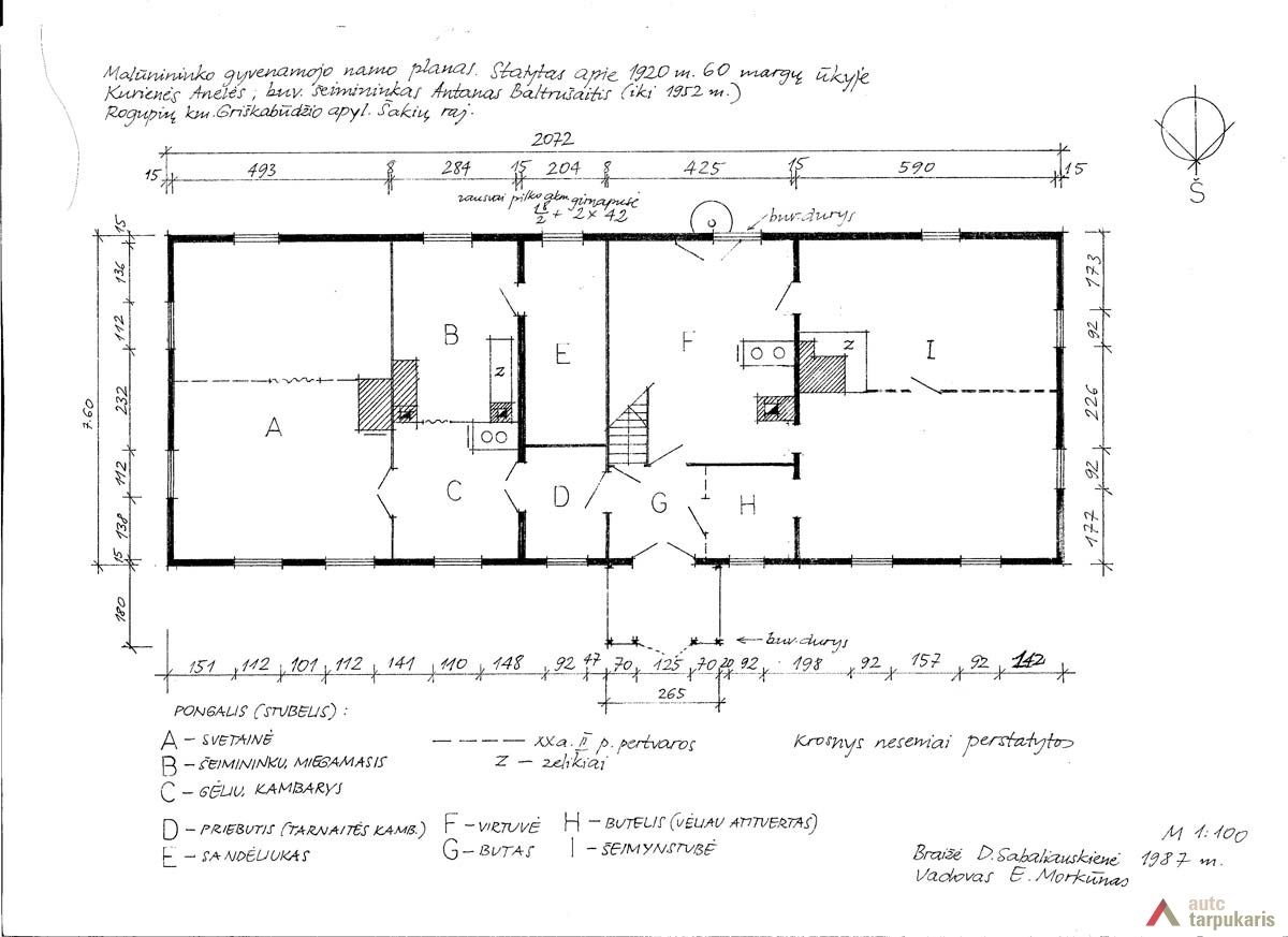 Šis suvalkietiškas namas (stuba) priklausė malūnininkui Jurgiui Baltrušaičiui, valdžiusiam 60 margų ūkį. Statytas apie 1920 m. Tradiciškai namas ilgas ir siauras (20,7x7,6 m). Stubos planinė struktūra plėtojosi iš trijų narvelių dviejų galų namo ir ilgainiui išsiskaidė į daugiau patalpų. Šią stubą sudaro tokios būdingos patalpos: namo centre – priemenė ir virtuvė (virtuvė turėjo atskirą įėjimą į lauką), viename namo gale buvo šeimynstubė, kurioje vykdavo šeimynos gyvenimas. Kitas namo galas (seklyčia, arba „pongalis“) suskaidytas mažesnėmis patalpomis: svetainė, šeimininkų miegamasis kambarys, gėlių kambarys. Nuo virtuvės atitvertas sandėliukas, kur susidėdavo rakandus, laikė daržoves. Gana nebūdinga patalpa – specialus kambarys tarnaitei (priebutis). Pastatui šildyti naudota tik šiam regionui būdinga krosnis-viryklė („mašina“) su pakura iš virtuvės ir šiltasuoliu („zelikiu“) stuboje. Šiame name yra dar viena krosnis su šiltasuoliu, įrengta kitame namo gale, kur miegodavo šeimininkai. Namas suręstas iš pjaustytų rąstų, suręstų į lygias kertes. Kertės užkaltos lentomis, kad apsaugotų sienojus nuo aplinkos poveikio. Stogas gegninis, dvišlaitis su nedideliais užlaidais. Namo skliautas apkaltas vertikliai lentelėmis.Ties pagrindiniu namo įėjimu pristatytas atviras prieangis („gonkos“), uždengtas dvišlaičiu stogeliu. Prieangio tvorelės sukaltos iš vertikalių lentelių. Namo langai šeimynstubėje keturių dalių, su kukliais antlangiais, „pongalio“ pusės langai platūs, trijų stiklų, būdingi vėlesniam laikotarpiui. Durys dvivėrės. Stubos pamatas išbetonuotas naudojant lauko akmenis ir plytas.