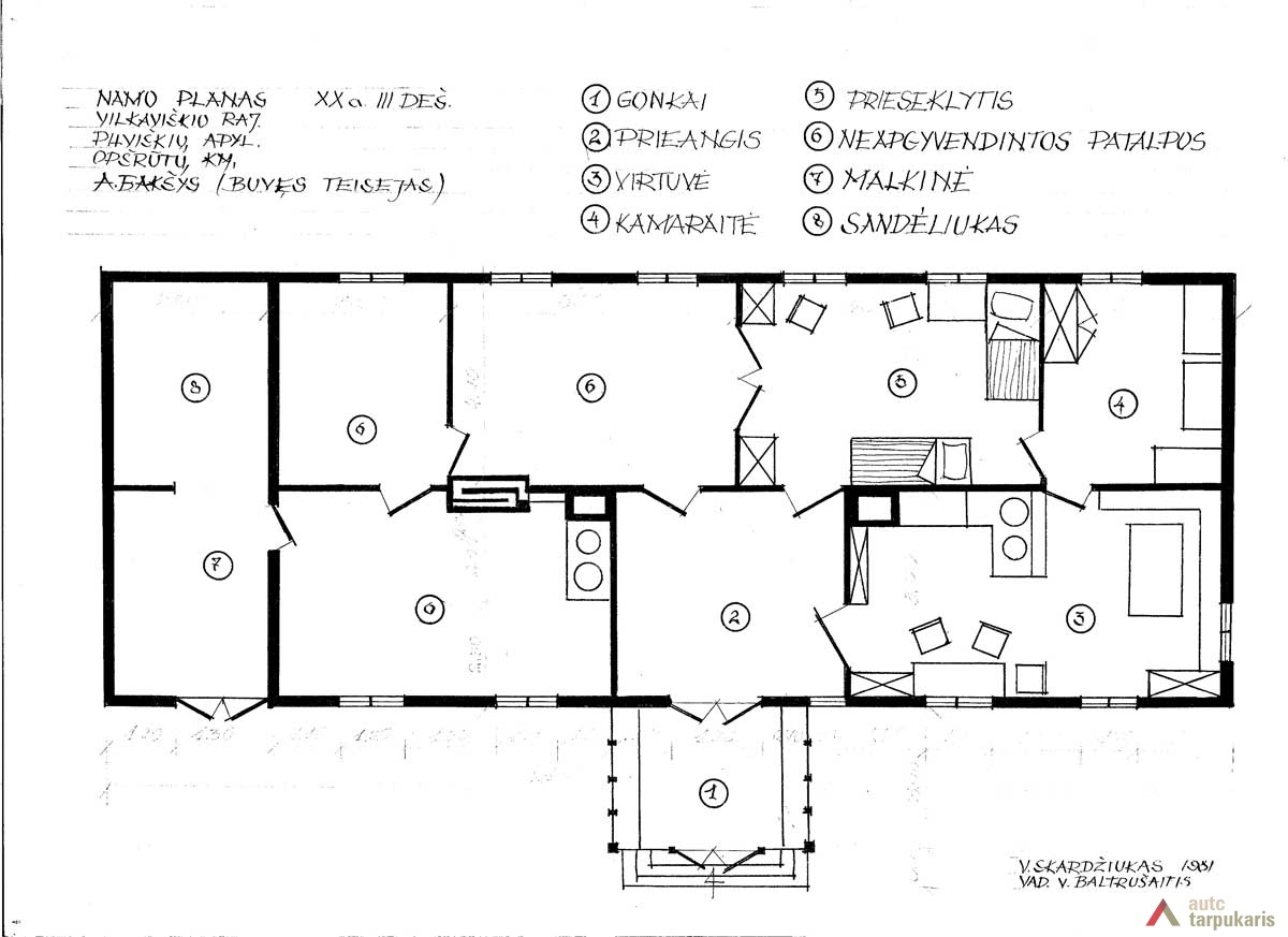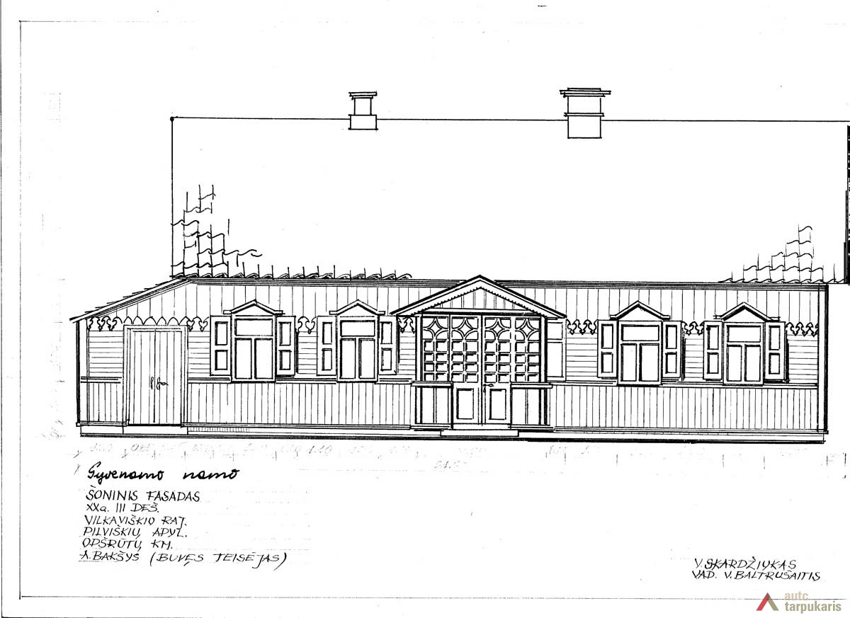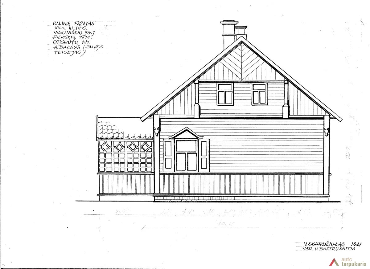 Namas statytas XX a. trečiame dešimtmetyje ir priklausė teisėjui A. Bakšiui. Pastatas ilgas ir siauras, su daug patalpų. Pasižymi gausiu dekoru, puošnumu. Namas medinis, suręstas iš pjaustytų rąstų ir visas apkaltas lentelėmis. Lentelės sukaltos skirtingai: cokolinė dalis (iki langų) – vertikaliai, pagrindinė namo dalis – horizontaliai, o pastogė – vėlgi vertikaliai, su dailiai išpjaustytais lentelių galais (širdelės formos), kurie sudaro ornamentą. Kertės apkaltos lentomis nuo aplinkos poveikio, pagegnių skydelis dekoratyvus (kaip ir apkalos – širdelės formos). Langai trijų dalių, virš jų – masyvūs sandrikai. Langinės įsprūdinės (dviejų įsprūdų). Stogas dvišlaitis su nedideliais užlaidais, dengtas čerpėmis. Namo skliautas puošnus, suskaidytas į penkias plokštumas, apkaltas vertikliai ir įžambiai lentelėmis – kaip tik tai ir suteikia jam puošnumo. Įžambiai sukaltos lentelės sudaro apverstos eglutės piešinį. Skliauto puošybą papildo maži langeliai. Į namą patenkama pro dengtą prieangį – įstiklintą verandą. Pagrindinį jos piešinį sudaro vertikalūs ir kryžmiški elementai, prieangiui suteikiantys lengvumo ir grakštumo. Stogelio kraštas puoštas pjaustiniais. Durys įstiklintos, dvivėrės. Prieangio apatinė dalis vertikaliai apkalta lentelėmis. Namo gale pristatytas priestatėlis, kuriame įrengtas sandėlis ir malkinė. Pamatas sumūrytas iš plytų. Stogas dvišlaitis, su nedideliais užlaidais, dengtas čerpėmis. Pastato planas (be priestatėlio) simetriškas, ne itin būdingas suvalkietiškoms stuboms. Iš viso turėjo 8 kambarius, visus pereinamus. Šildymui naudotos dvi krosnys.