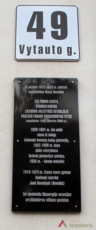 Namą 1913 metais pasistatė Ukmergės verslininkai Kazimieras ir Teofilė Deveikiai, jame užaugo visuomenės veikėja, istorikė Jonė Deveikytė-Navakienė. Iš pat pradžių, t.y. dar caro valdžios laikais, pastato rizalitą puošė reljefinis lietuviškas Vytis. Kitas išskirtinis pastato elementas – cementinės meškų skulptūros, „pakabintos" ant šoninių rizalitų karnizų. Gatvės fasado tarplangiuose – piliastrai su stilizuotais kapiteliais, papuošti lapų girliandomis – festonais. Dekoratyviniai elementai su augaliniais motyvais panaudoti ir frize, taip pat įdubose tarp langų.